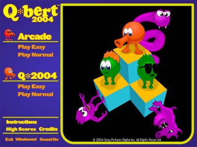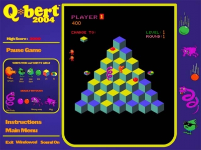 Description:Hop Q-bert around the board while avoiding Coily, Ugg, Wrongway, Slick and Sam! Look out for Coily, he'll chase Q-bert all around the board. Change the color of the cubes to complete each round. Based on the 80's arcade phenomenon, Q-bert 2004 offers 50 different board shapes and 6 different visual themes, including the classic, blocky graphics from the original 1983 game. Hop Q-bert through world after world, or play random mode and never play the same game twice! Screenshots: