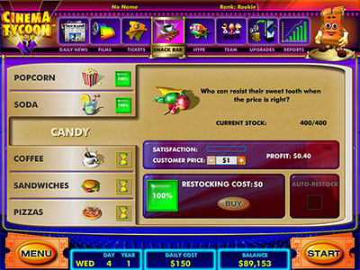 Description:Do you have what it takes to become a Cinema Tycoon? Find out in this exciting and addictive new simulation! Select the movies, buy upgrades, and hype your Cinema to become the next Mega-Plex. Choose the next big Hit, avoid the Flops, and don't forget the competition. Enjoy beautiful graphics, animation and sound. With three unique games and locations, this game offers endless play. Cinema Tycoon promises hours of entertainment - Try it today! Screenshots: